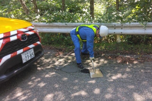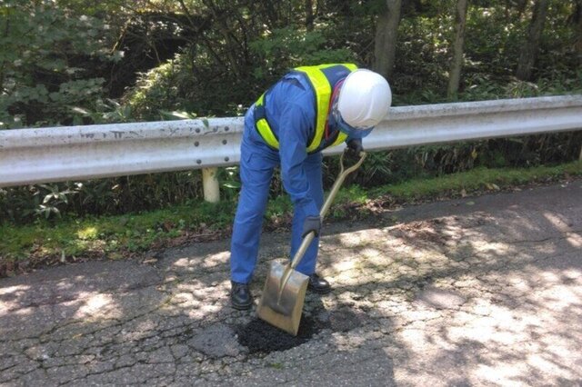 写真は、沼田市内において道路の穴埋めをした時の様子です。