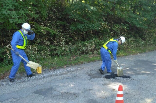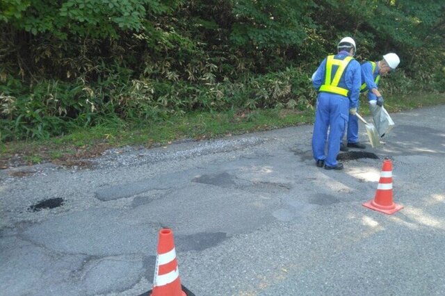 写真は、沼田市内において道路の穴埋めをした時の様子と、道路上に垂れ下がった枝を除去した時の様子です。
