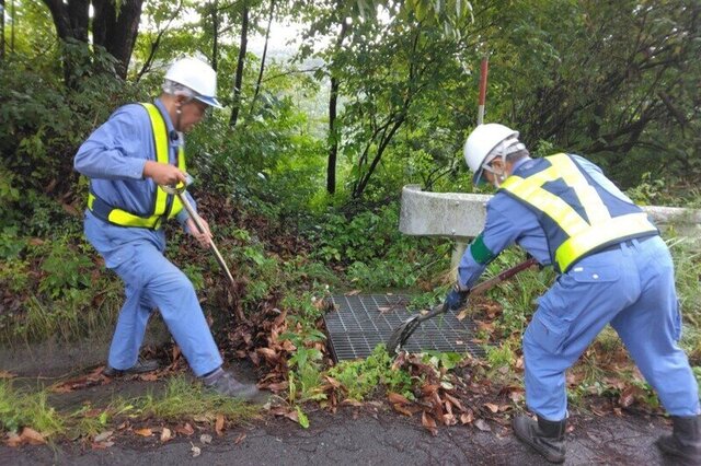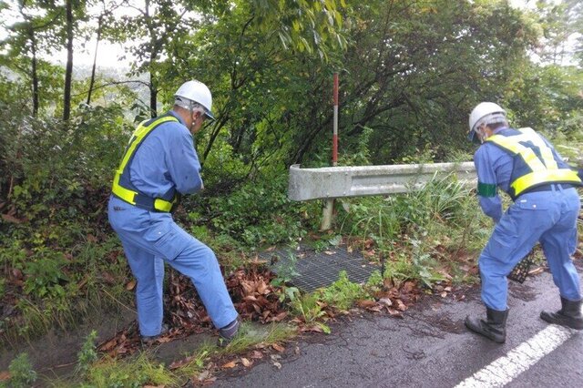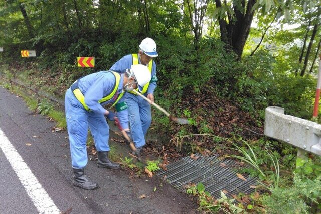 写真は、東吾妻町の高崎東吾妻線において側溝内に詰まった落葉を除去した時の様子です。