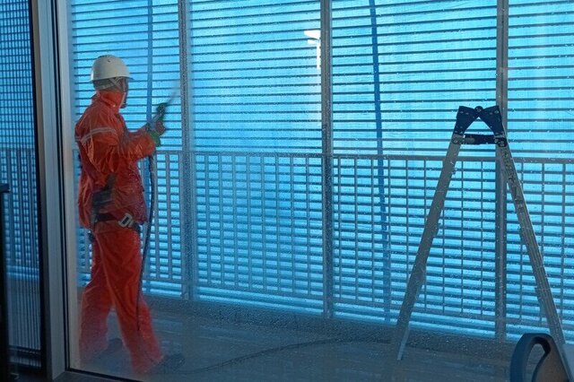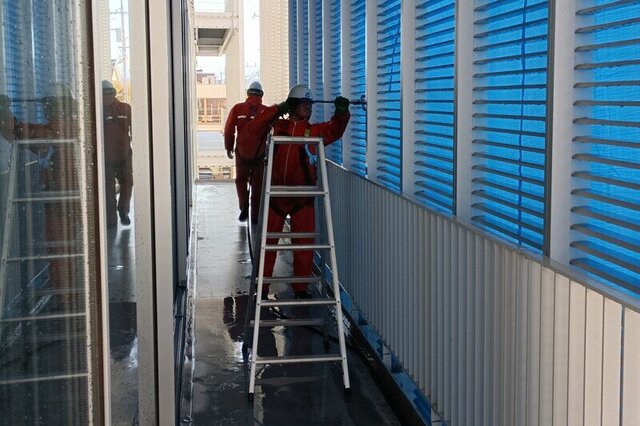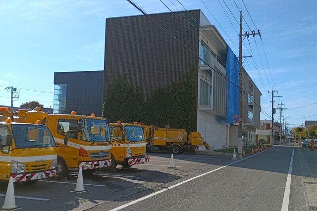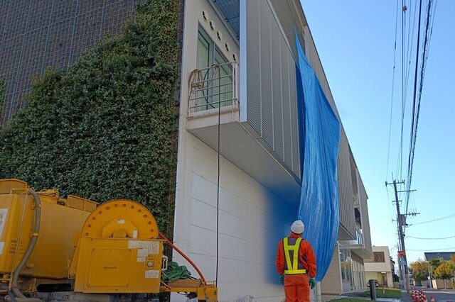 11月4日(火)に群馬県建設事業協同組合で管理運営している「群馬建設会館」のルーバーを、組合所有の高圧洗浄車を使って、職員によりルーバー表面に付着した砂や埃、雨による水垢などを清掃しました。
