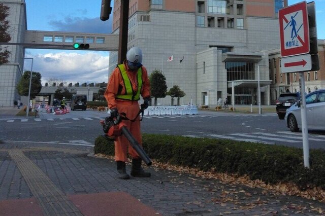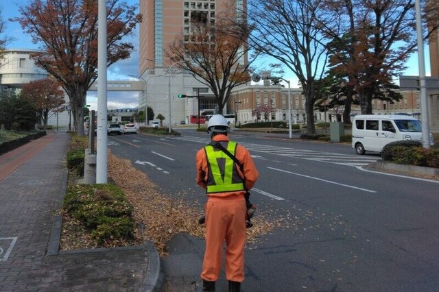 この時期は、事前にブロアーで歩道の落葉を道路へ掃き出し、その落葉を路面清掃車(スイーパー)で清掃しております。