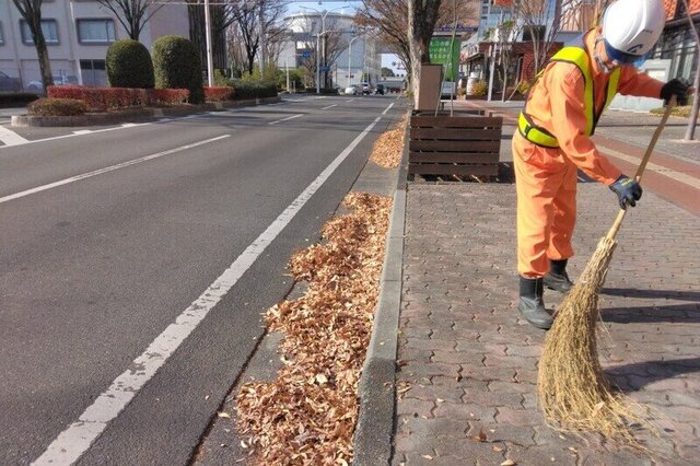 この時期は、事前にブロアーや竹ぼうきで歩道の落葉を道路へ掃き出し、その落葉を路面清掃車(スイーパー)で清掃しております。