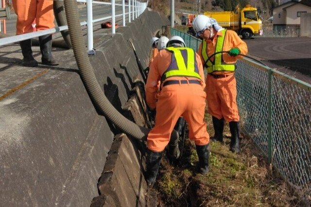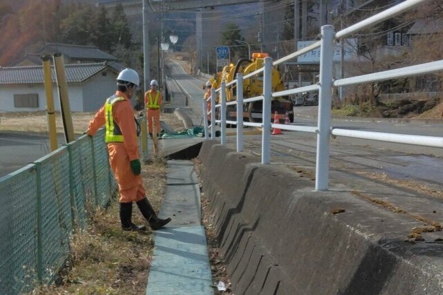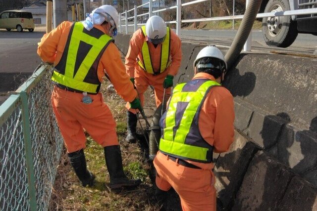 群馬県建設事業協同組合では、自社所有の重機や車両(高圧洗浄車・汚泥吸引車)などを使い、県管理道路の側溝清掃を行っております。