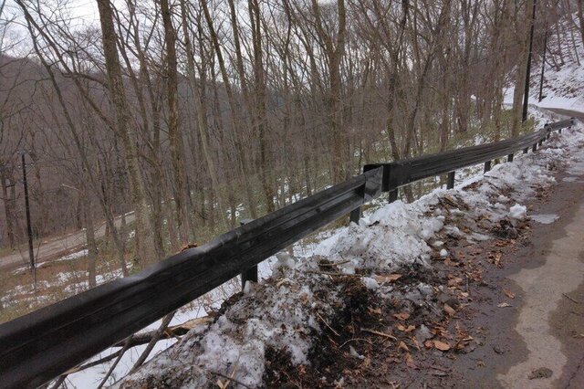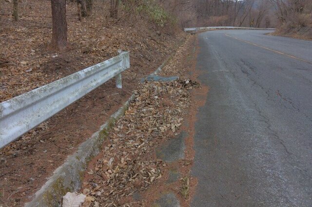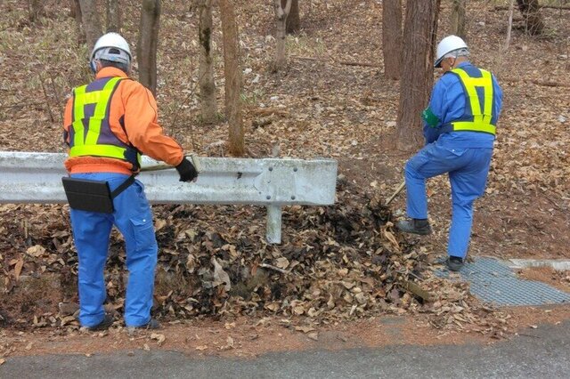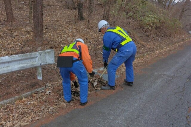 山間部のパトロールでは穴埋めの他、写真のように側溝に溜まった落葉の除去や、落石・倒木・折れ枝等の路上障害物を除去する事もあります。
