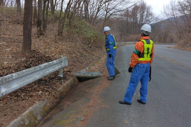 写真は、3月中旬に東吾妻町大戸地内の県道28号(高崎東吾妻線)において側溝内に詰まった落葉を除去した時の様子と、草津町内の県道55号線(中之条草津線)で倒木を除去した時の様子です。