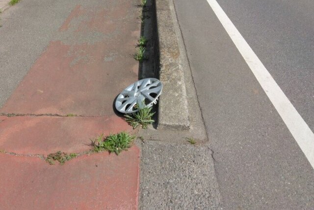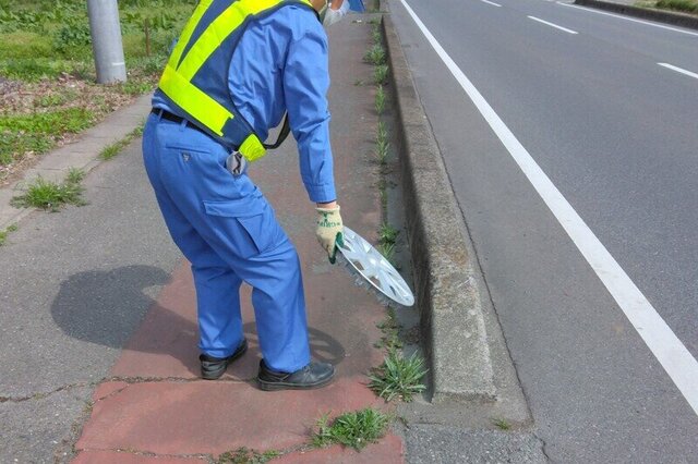 写真は、前橋市鼻毛石町地内(苗ケ島飯土井線)において道路脇に落ちていたホイルキャップを回収した時の様子です。