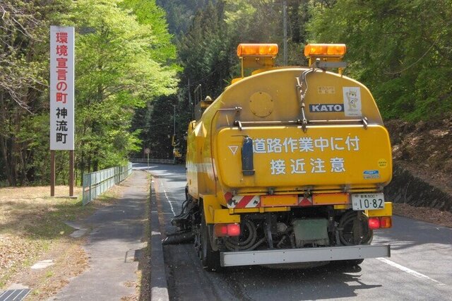 写真は、藤岡神流町尾附地内の国道299号線を路面清掃した時の様子です。