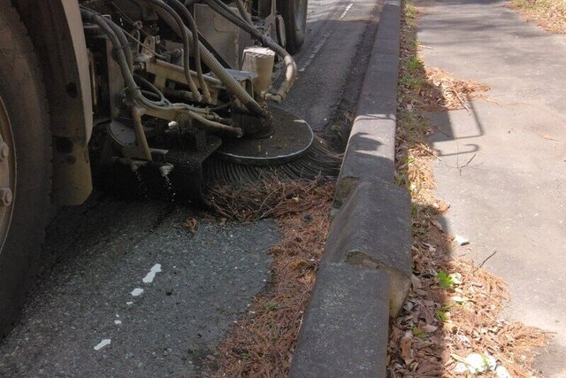 この時期は、冬季に散布され道路脇に溜まった「スリップ止めの砂」や「落ち葉」をメインに清掃しております。